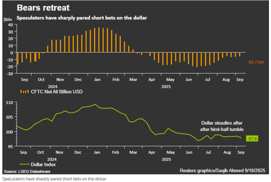 尽管近期美元汇率因看跌期货头寸大幅回撤而企稳,但美国商品期货交易委员会(CFTC)数据显示,截至上周,投机者的美元净空头头寸为57亿美元,虽较6月底的210亿美元大幅下降,但仍处于历史高位。