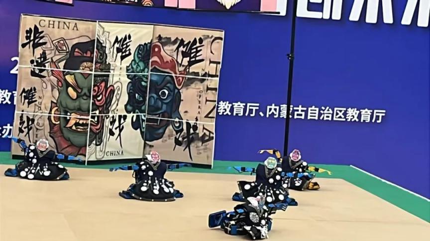 来自北京石油化工学院的“机傩万象队”以传统傩戏为灵感改编舞蹈,将非遗文化与机器人结合。半两财经在现场看到,机器人头戴面具,所穿服装融入苗族传统服饰特色,黑神话悟空的《三界四洲》音乐响起,五个机器人以非常具有古风特色的作揖开场,紧接着“领舞”做了一个高难度侧翻,稳稳的“台风”得到评委和观众的认可。机器人在做劈叉动作的基础上,通过手脚配合,使身体呈现波浪形律动。