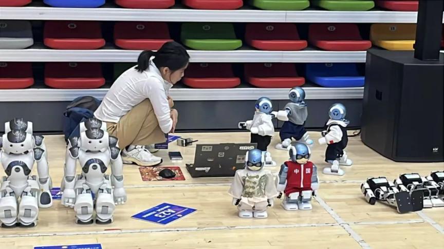 正式比赛开始后,当自家小机器人在台上表演时,“指导老师”们便纷纷化身这些“明日之星”的站姐站哥打call。而当其他队伍的机器人上台时,他们又变成要求严格的家长,比照着“别人家的孩子”,希望自家孩子进一步优化。“你看,它们其实和我们的问题一样,都重心不稳,但它们在后面加了一对小翅膀。”